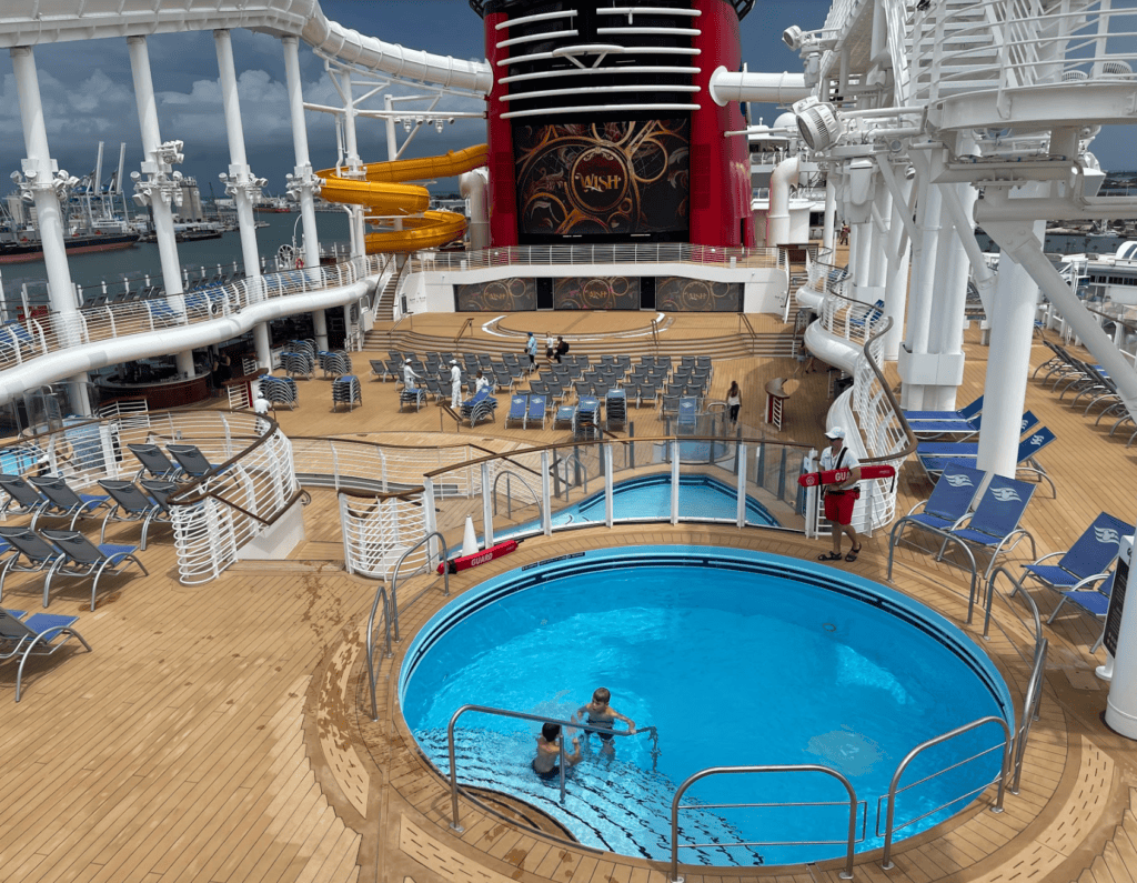 The Imagineers made sure that the design of the pool deck was for all ages on the Disney Wish. Instead of one big pool, there are seven pools onboard between decks 11,13 and 14 and one in the adult area, one in the concierge area.